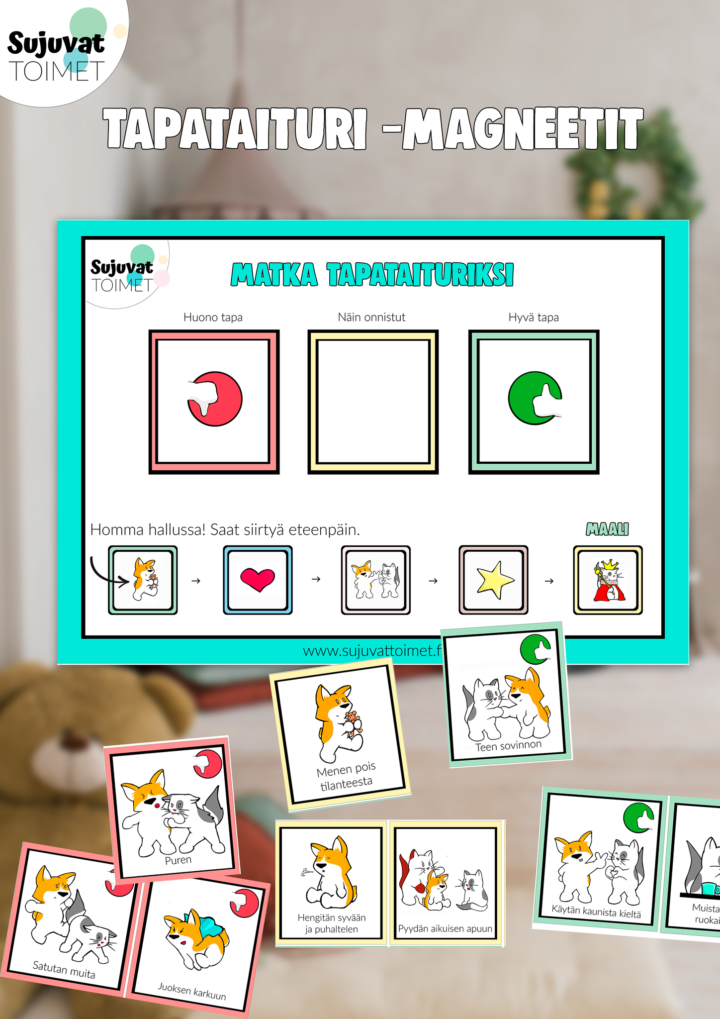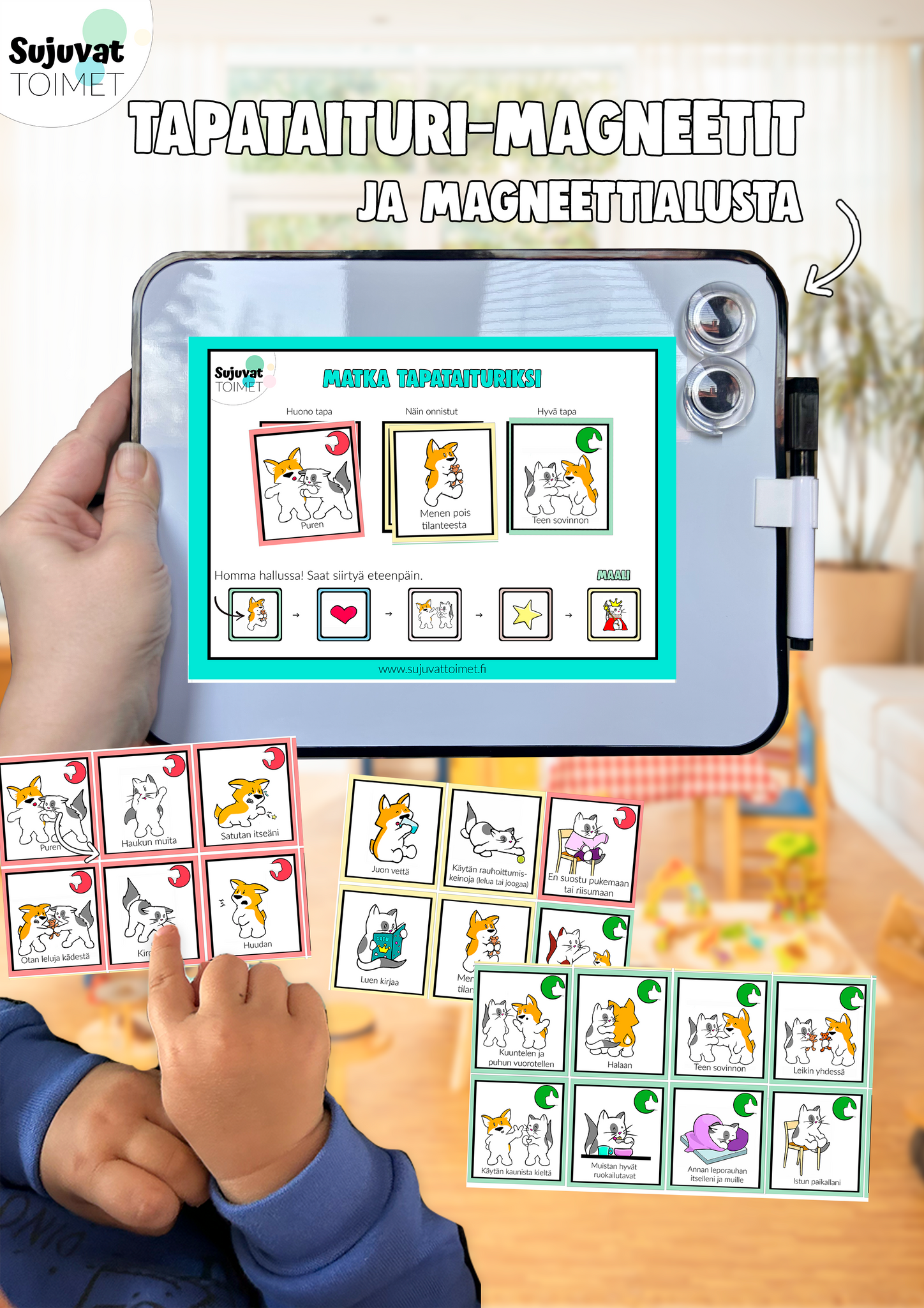 Tapataituri-magneettien avulla lapsi voi opetella pois huonoista tavoista ja harjoitella tilalle uusia, positiivisia toimintamalleja. Yhdessä harjoittelu on leikinomaista, kannustavaa ja hauskaa!