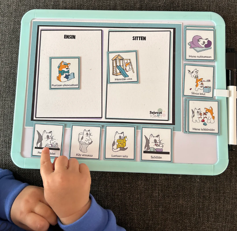 Sujuvat toimet -toimintamagneetit ja Tunne&toimi -kortit auttavat rutiinien opettelussa ja arjen ennakoimisessa. Ne auttavat lasta keskittymään ja näyttävät selkeästi – mitä tehdään ensin ja sitten. Selkeiden kuvien ja toiminnanohjauksen avulla arjen haasteet vaihtuvat onnistumisen iloon: se meni hienosti!