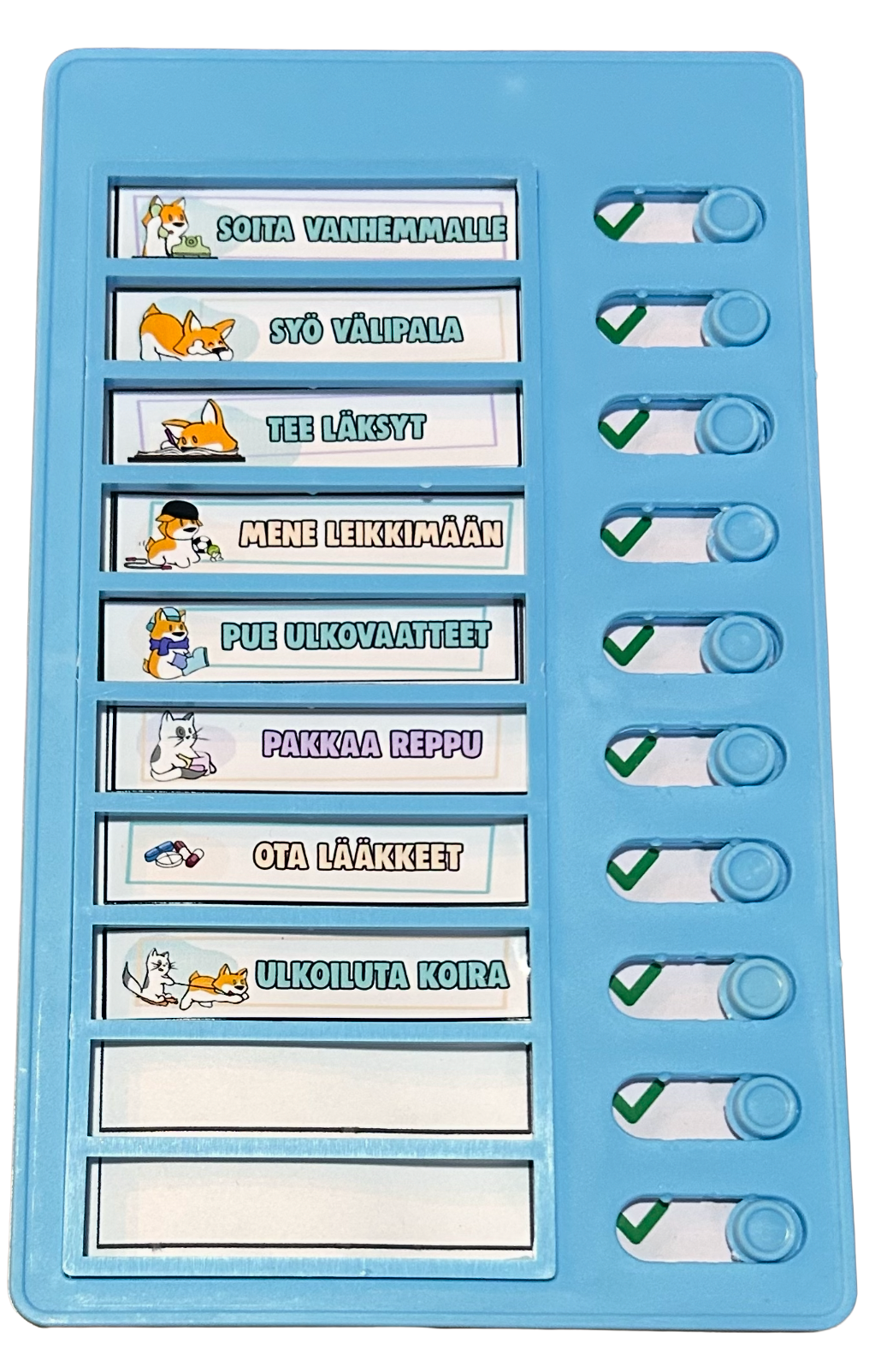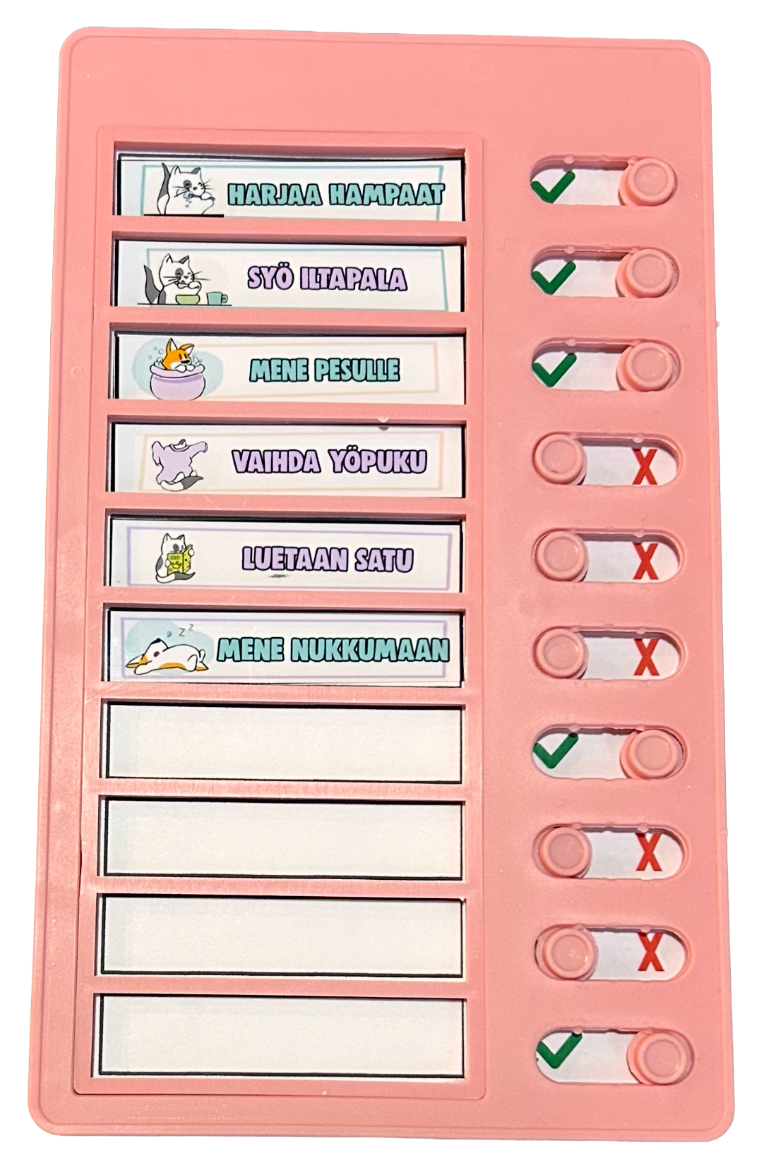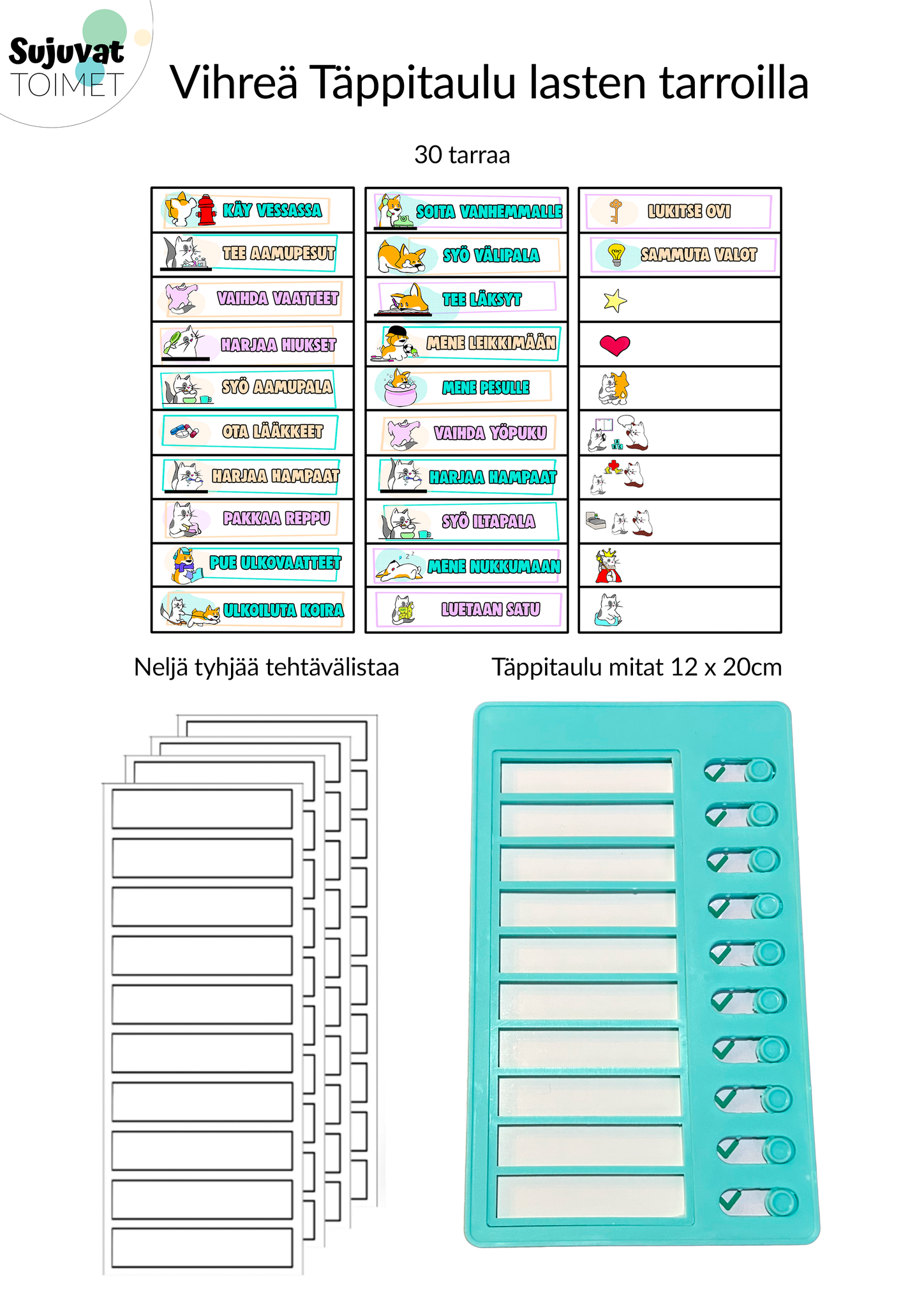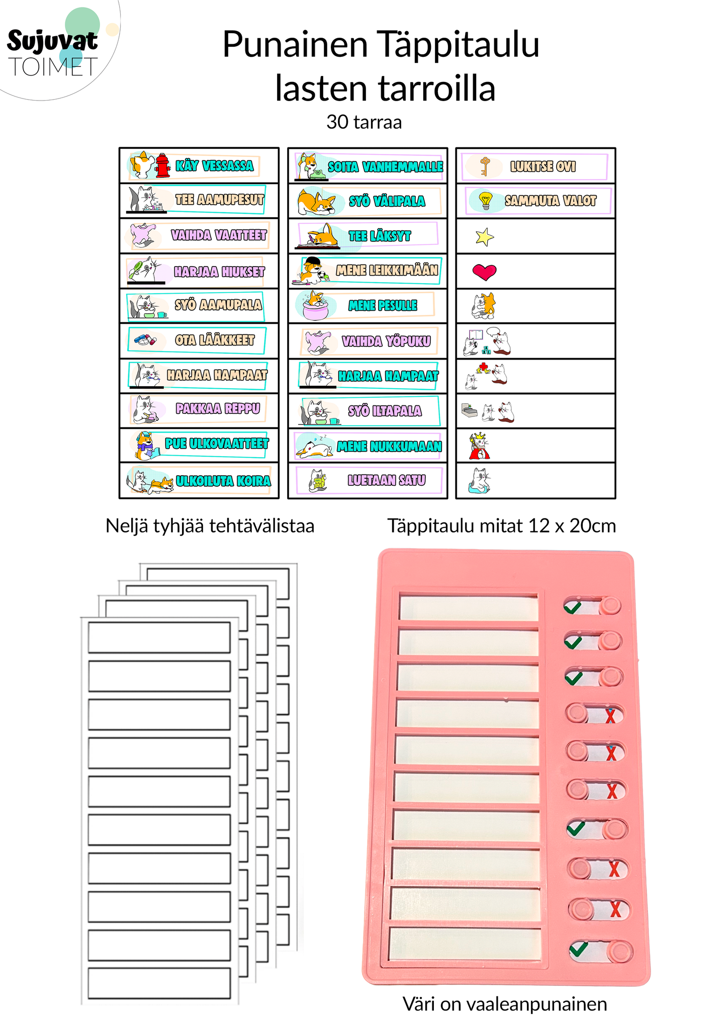 - Kokoa tehtävälista Täppitauluun pakkauksen mukana tulevista tarroista.