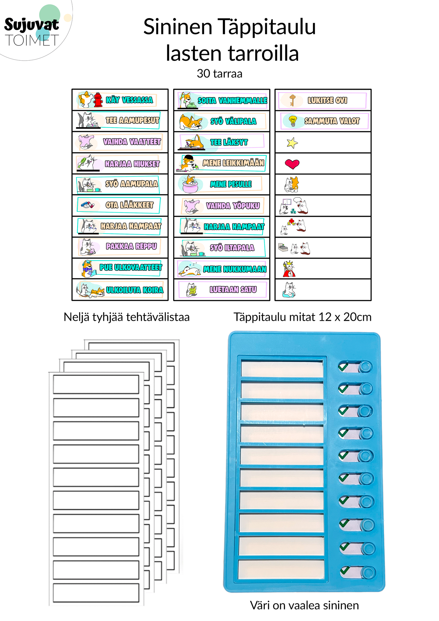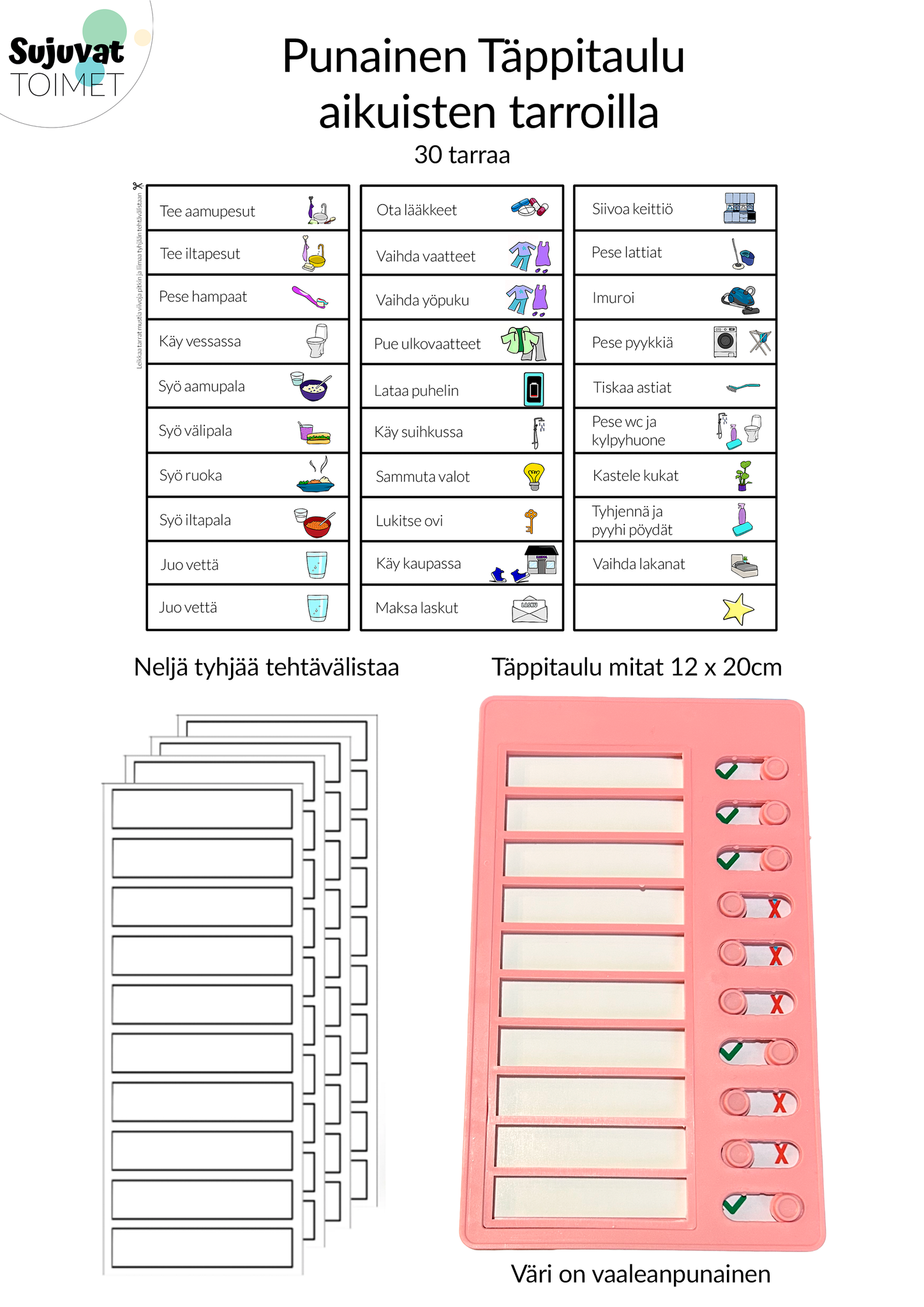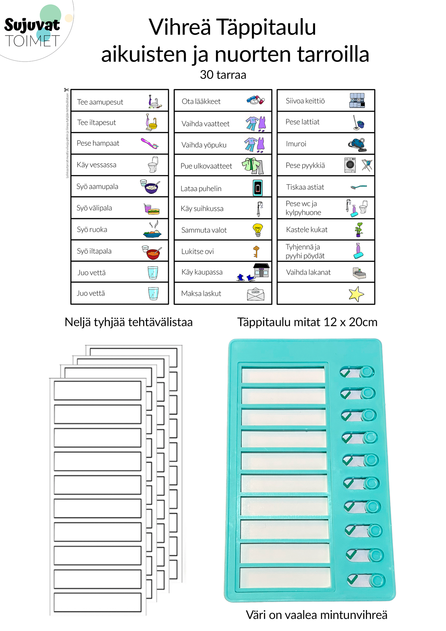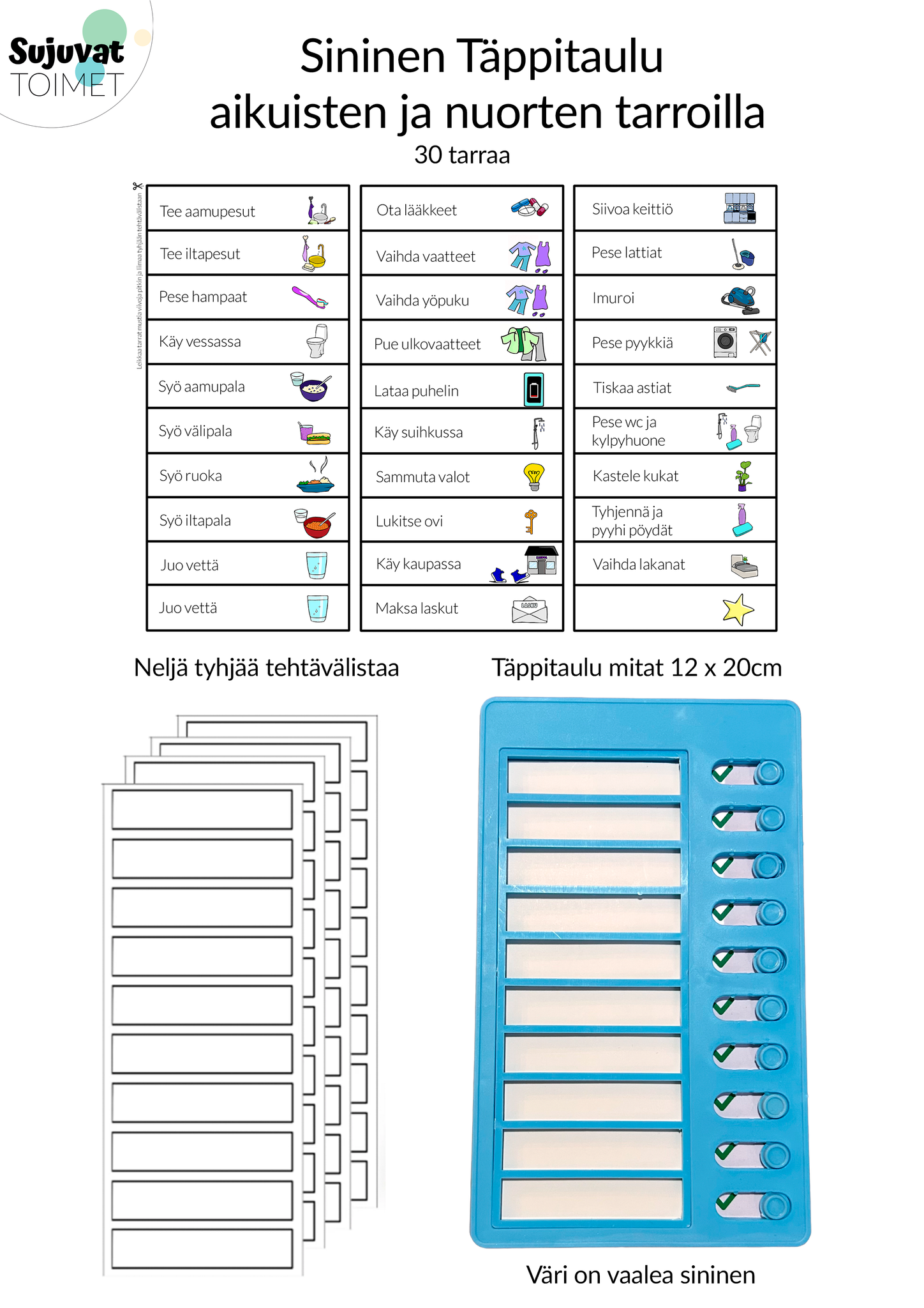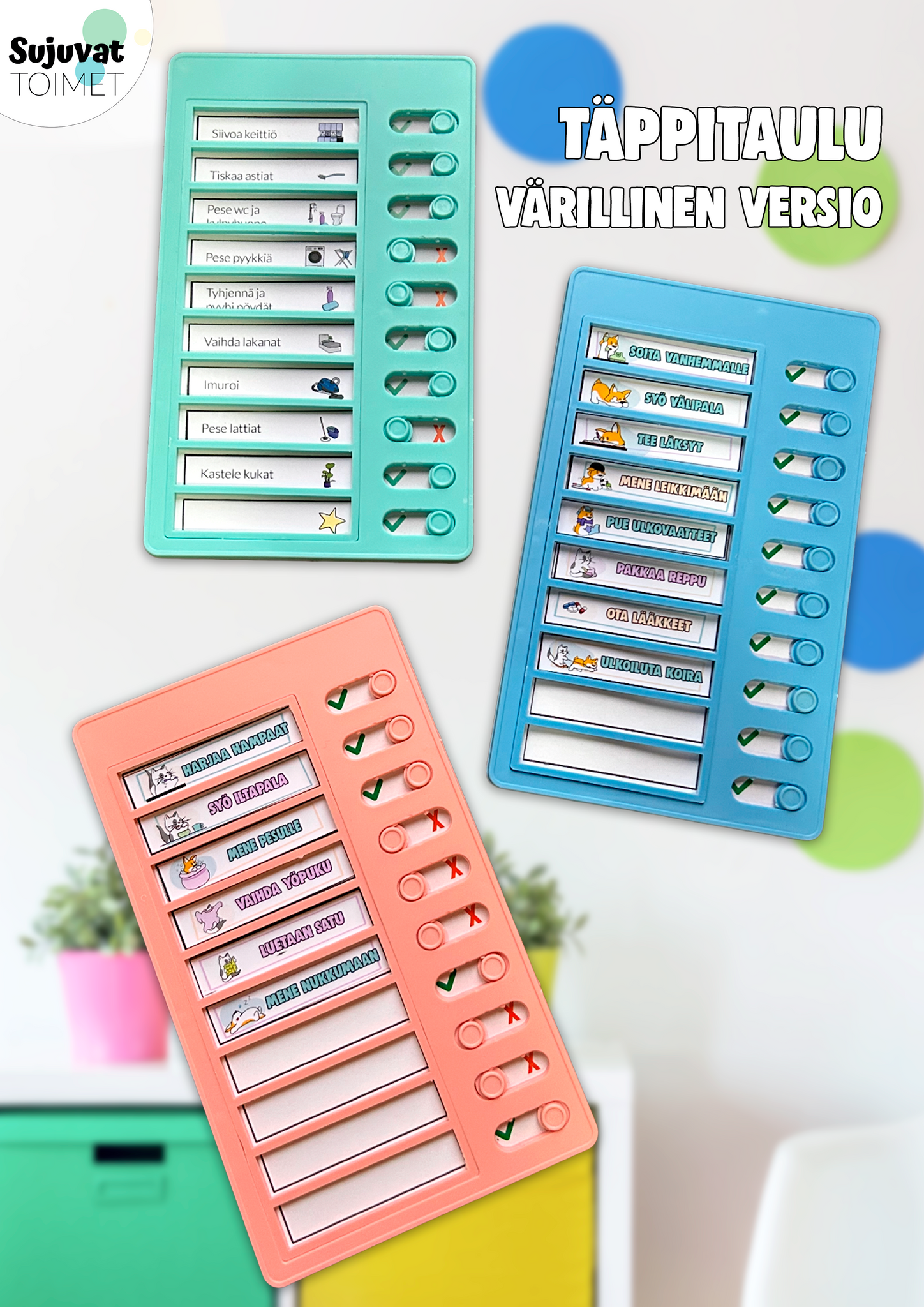 Selkeä ja helppo käyttöinen Täppitaulu on sovellettavissa moneen tarpeeseen. Sitä voi käyttää rutiinien harjoitteluun, arjen suunnitteluun tai erilaisten muistettavien asioiden listaamiseen.