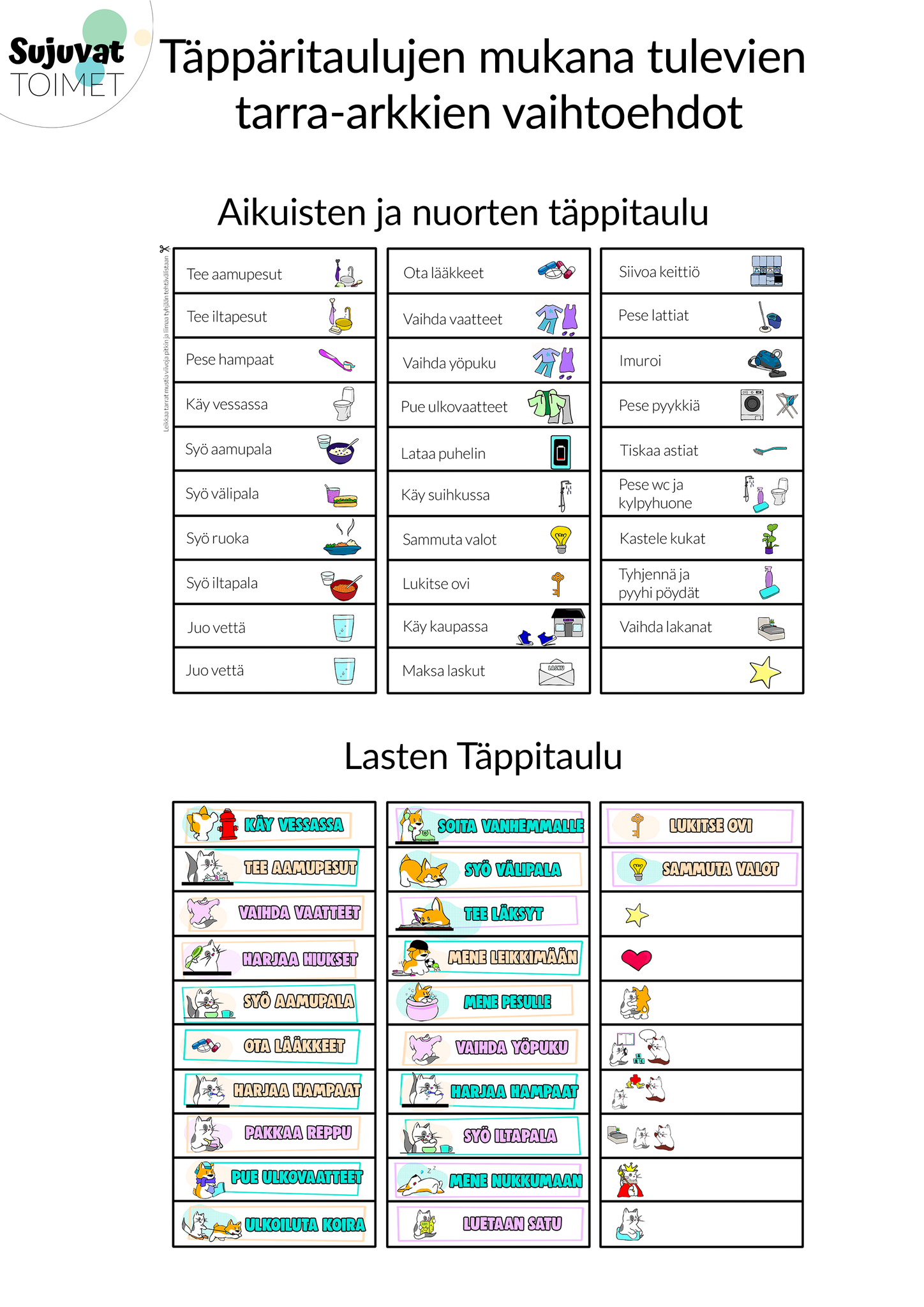Täppitaulu on uudelleen käytettävä. Voit koota valmiita Täppitaulun käyttäjälle sopivia listoja, joita on helppoa vaihtaa myös päivän aikana ja käyttää niitä aina uudelleen. Esimerkiksi aamu-, iltapäivä- ja iltatoimet tai vaikka viikon aikana hoidettavat kotityöt ovat hyviä uudelleen ja uudelleen käytettäviä listoja. Toistojen kautta toimista muodostuu rutiineja.